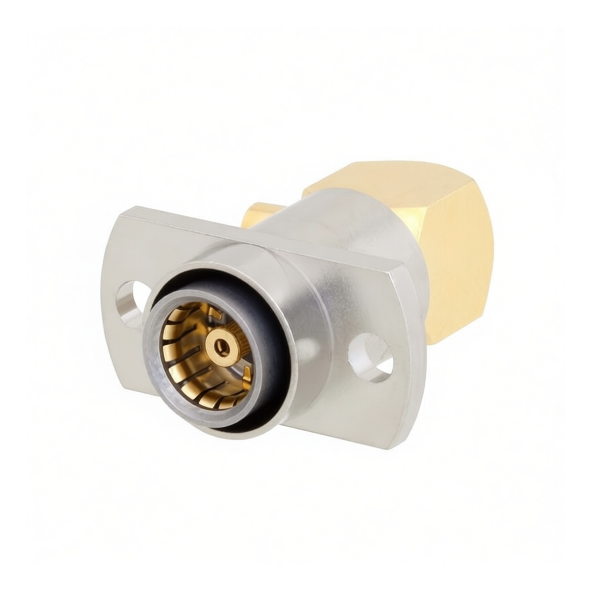 This BMA female right-angle solder connector features a robust brass construction with a gold-plated body, engineered for reliable performance in demanding RF applications. Designed specifically for RG405 and equivalent semi-rigid coaxial cables, the unit utilizes a slide-on interface and a two-hole flange mount for secure panel installation. Rated for up to 300V and 2A, this connector ensures stable signal transmission while maintaining a compact profile. The welded termination method provides a permanent, low-loss connection ideal for fixed infrastructure where vibration resistance and long-term durability are critical requirements.