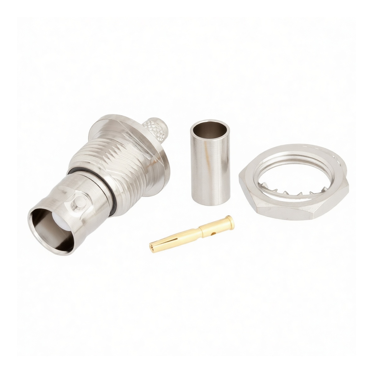 This BNC bulkhead female connector delivers reliable RF performance for RG58, PE-C195, PE-P195, and LMR-195 coaxial cables. Constructed from durable copper, it features a robust design with isolated grounding to minimize signal interference. The unit utilizes precise crimp termination methods for both the center pin and outer ferrule, ensuring secure mechanical connections and consistent electrical continuity. Rated for 300V and 2A, this connector is engineered for demanding industrial applications requiring stable signal transmission in compact panel-mount configurations.