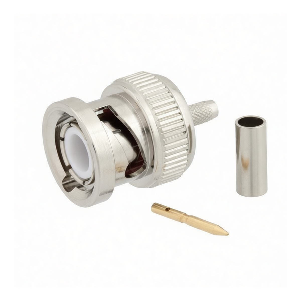This BNC male RF connector is engineered for reliable signal transmission in professional coaxial assemblies. Constructed from durable copper, it features a robust crimp attachment method for both the center pin and outer ferrule, ensuring secure mechanical bonding and consistent electrical performance. Designed specifically for 0.100-inch diameter cables, including RG316, RG174, and LMR-100 variants, this component supports operation up to 300V and 2A. Its precision engineering delivers low loss connectivity ideal for demanding telecommunications and test instrumentation applications requiring strict impedance control.