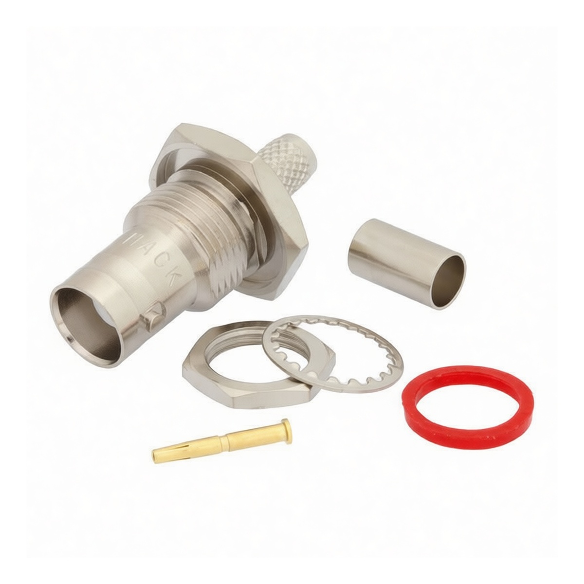 This BNC straight bulkhead female connector provides a reliable interface for RG59, RG62, and RG71 coaxial cables in professional video and data applications. Constructed from durable brass, the unit supports a voltage rating of 300V and a current capacity of 2A, ensuring stable signal transmission. Designed for panel mounting, it features a precise 0.48-inch D-hole for secure installation. The connector accommodates both crimp and solder attachment methods, offering versatile termination options for custom cable assemblies while maintaining robust mechanical integrity in demanding environments.