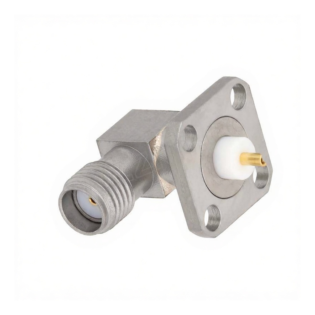 SMA Female Right Angle RF Connector, Copper, 4-Hole Flange, 0.34" Spacing