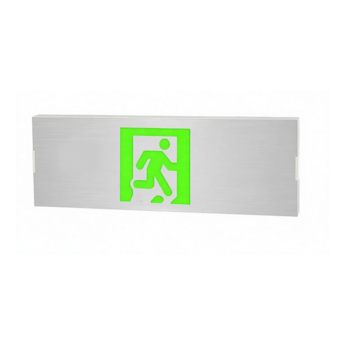 This single-face exit sign features a durable brushed aluminum panel and high-visibility green lettering for clear egress identification. Operating on a safe 36V DC low-voltage system with 2W power consumption, the unit includes an integrated battery backup providing 90 minutes of emergency illumination during power failures. Designed with an IP30 rating, this non-directional safety fixture is suitable for indoor commercial environments requiring reliable code-compliant signaling. The robust all-plastic housing ensures long-term performance while minimizing maintenance requirements for facility managers.