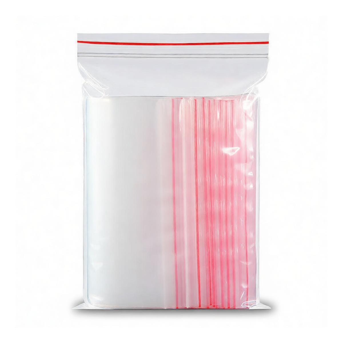 These clear polyethylene reclosable bags feature a distinctive red zipper track for enhanced visibility and secure containment. Measuring 9.8 inches in width by 13.8 inches in length, each unit is constructed from durable 8-micron (approx. 0.31 mil) film with a short-side opening design ideal for efficient packaging workflows. The press-to-seal mechanism ensures reliable closure for repeated access while maintaining product integrity. Supplied in packs of 100, these lightweight bags offer a cost-effective solution for organizing small parts, retail goods, or industrial components without the need for handles.