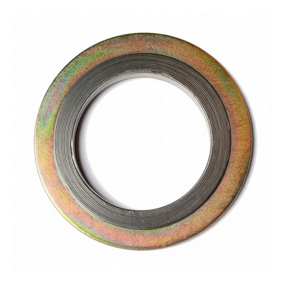 This C-ring retaining washer is engineered for demanding high-pressure and high-temperature sealing applications in industrial piping and flange systems. Its robust construction combines a durable carbon steel outer ring with a resilient graphite filler, creating a reliable metal gasket that conforms to flange faces to prevent leaks. The design is specifically tailored for use in critical process environments where system integrity is paramount.