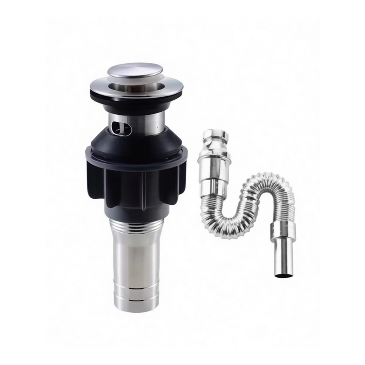 Constructed from corrosion-resistant 201 stainless steel for long service life Push-to-seal and push-to-release pop-up mechanism for convenient, touch-free operation Standard 1.26-inch diameter fits the majority of commercial and residential bathroom sinks Includes an integrated tailpiece for direct connection to the sink's P-trap