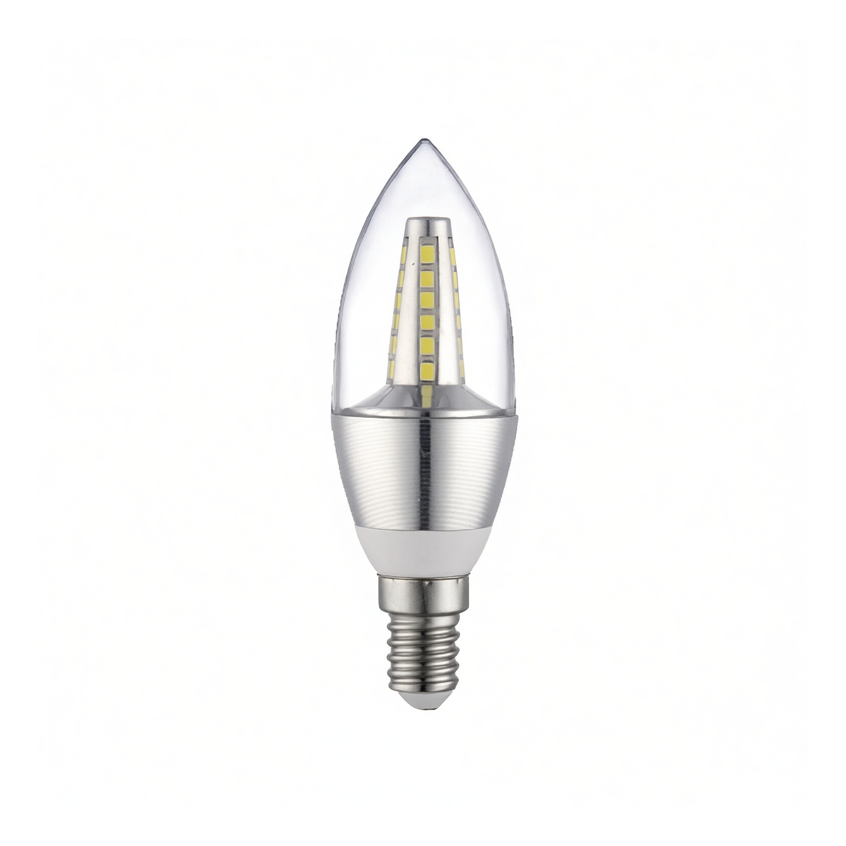 This 3.5-watt silver-finish candle bulb features an E14 base, engineered specifically for compatibility with standard track light fixtures. Delivering crisp white illumination, the unit provides energy-efficient performance suitable for commercial display and accent lighting applications. Its compact (pointed tip) design ensures seamless integration into decorative luminaires while maintaining a professional aesthetic. Sold in bulk packages of 100 units, this fixture component offers reliable longevity and consistent color output for large-scale installation projects requiring uniform lighting standards across extensive facilities.