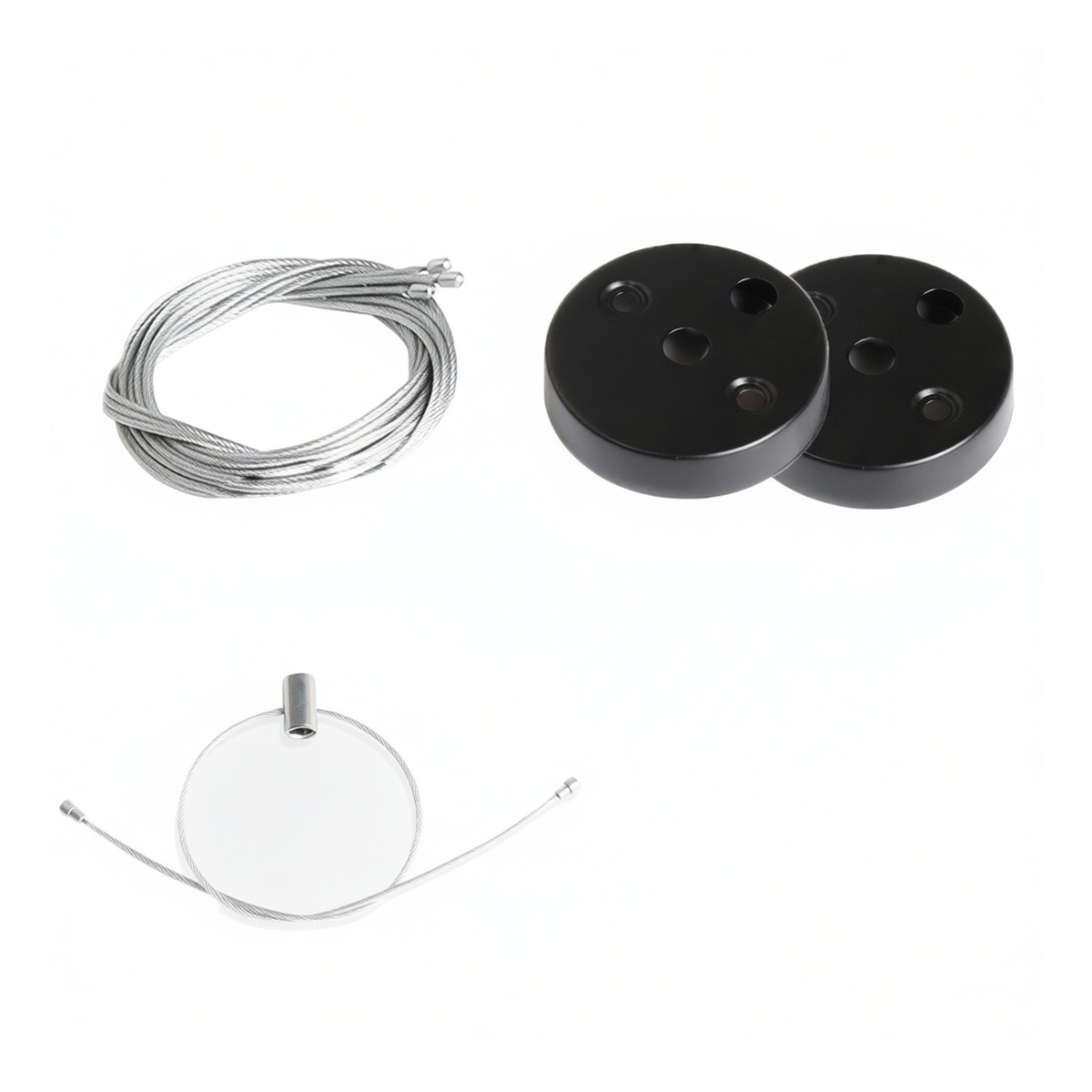This professional suspension kit provides a secure mounting solution for track light fixtures, featuring a durable black steel ceiling canopy and high-tensile aircraft-grade cable. Each 12-inch assembly includes a robust one-to-two cable splitter, a precision adjustable cable lock for exact height positioning, and heavy-duty fixing screws. Designed to support substantial loads with stability, the system ensures safe installation in commercial environments. Supplied in packages of twelve units, this complete hardware set streamlines project deployment while maintaining a sleek, low-profile aesthetic suitable for modern industrial applications.