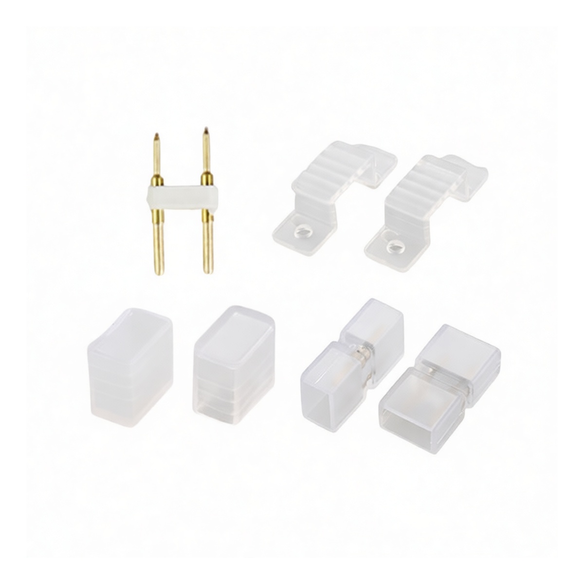 This comprehensive accessory kit provides essential mounting and connection hardware for professional LED strip light installations. The package includes ten end caps to seal strip termini, ten mounting clips for secure surface attachment, and ten splice connectors for seamless linear extensions. A single intermediate connector facilitates flexible circuit bridging across longer runs. Constructed from durable plastic, these components ensure reliable mechanical support and electrical continuity in commercial track lighting systems. Designed for standard profile compatibility, this 36-piece set streamlines inventory management and accelerates deployment for large-scale lighting projects requiring efficient, modular assembly.